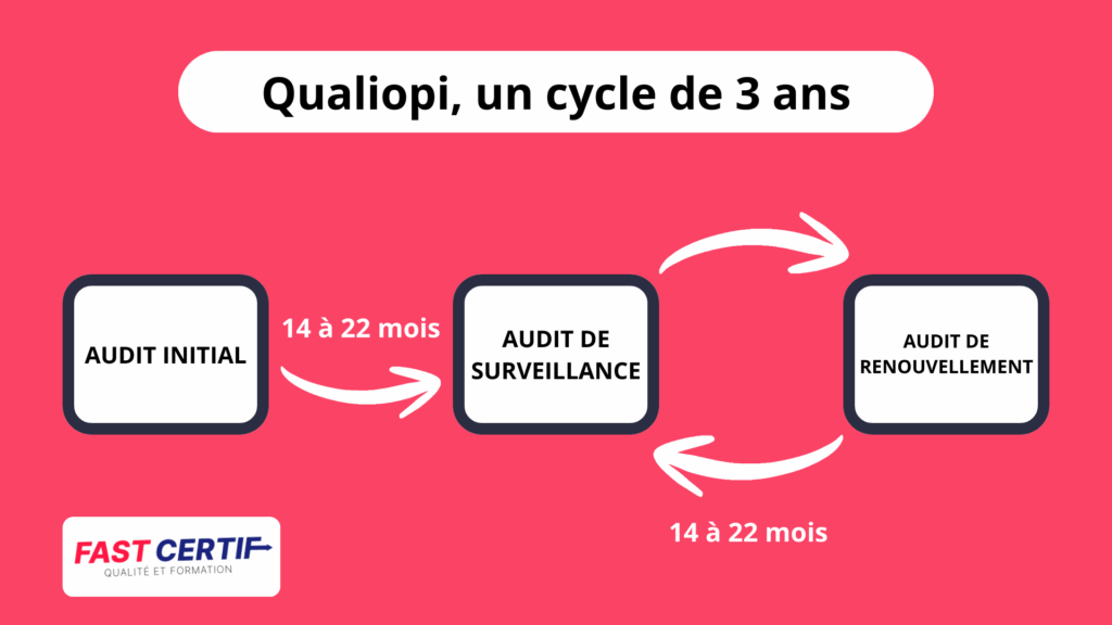 Le référentiel national qualité prévoit trois étapes : audit initial, audit de surveillance entre le 14e et le 22e mois, puis audit de renouvellement avant l’échéance du certificat.